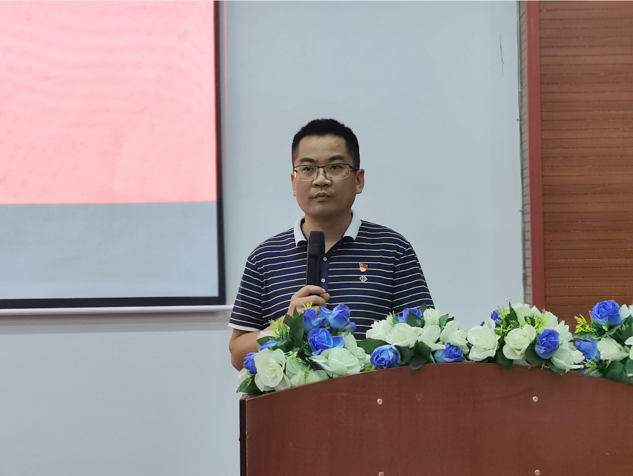 预备党员代表黄磊发言。他表示要充分发挥党员模范带头作用,积极主动作为,做好本职工作,希望大家能够学有所成,将个人追求融入党和国家的事业中,为中华民族伟大复兴的中国梦贡献青春力量