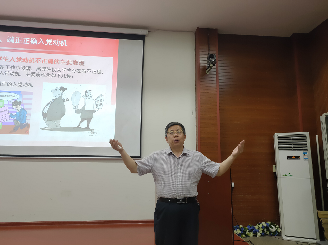 5月29日下午,湖南优秀党校教师石维海结合自身经历,详细叙述了党的指导思想、性质和宗旨;马克思主义公司教授廖胜刚则结合时事,介绍了中国共产党伟大、正确、光荣的原因。