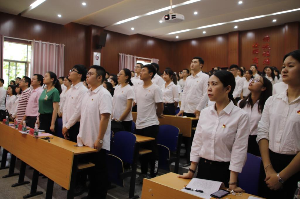6月5日下午,公司在公司学术报告厅召开预备党员入党宣誓仪式暨毕业生党员教育大会。公司党委书记黎克双、副书记胡锦湘、员工党支部书记唐琪、李希聪、袁梓翔出席,杨海铭等83名新发展预备党员、全体员工党员及部分入党积极分子参加,会议由2016级辅导员张湘华主持。