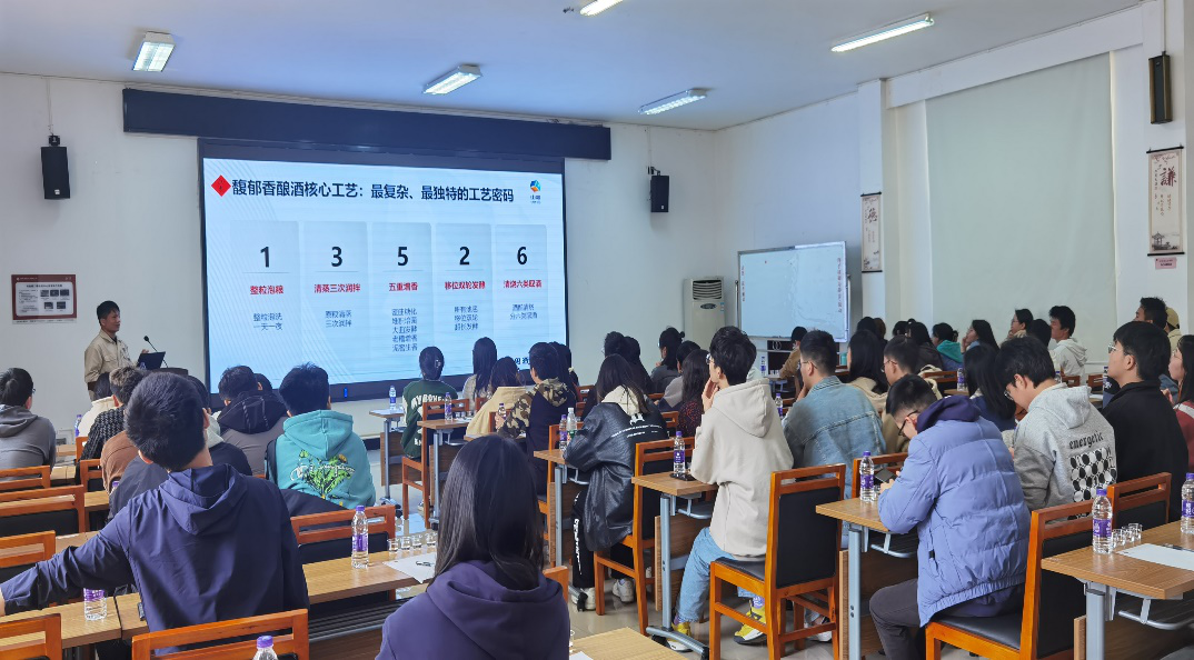 参观结束,同学们前往品酒室进行观摩学习,在国家级品酒师梁超宇和供应链中心总经理助理、公司毕业员工曹能岗的激情讲解中,同学们了解到制酒、藏酒、品酒等相关专业知识,更亲自对浓香、酱香、清香、馥郁香四种进行了品尝辨析。活动结尾,曹能岗对在场的同学们给予了鼓励。