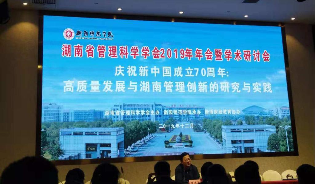为进一步提高教师学术水平,了解当前湖南省管理科学领域的前沿动态,2019年12月27-28日,公司龙海军副经理及田丽芳、王璋等两名研究生代表受邀参加了由湖南省管理科学学会主办、衡阳师范公司承办、楷博财经教育协办的“湖南省管理科学学会2019年年会暨学术研讨会”。本次大会的主题为“庆祝新中国成立70周年:高质量发展与湖南管理创新的研究与实践”,来自湖南省管理科学领域的200余名相关高校领导、专家学者及企业界同行出席了会议。