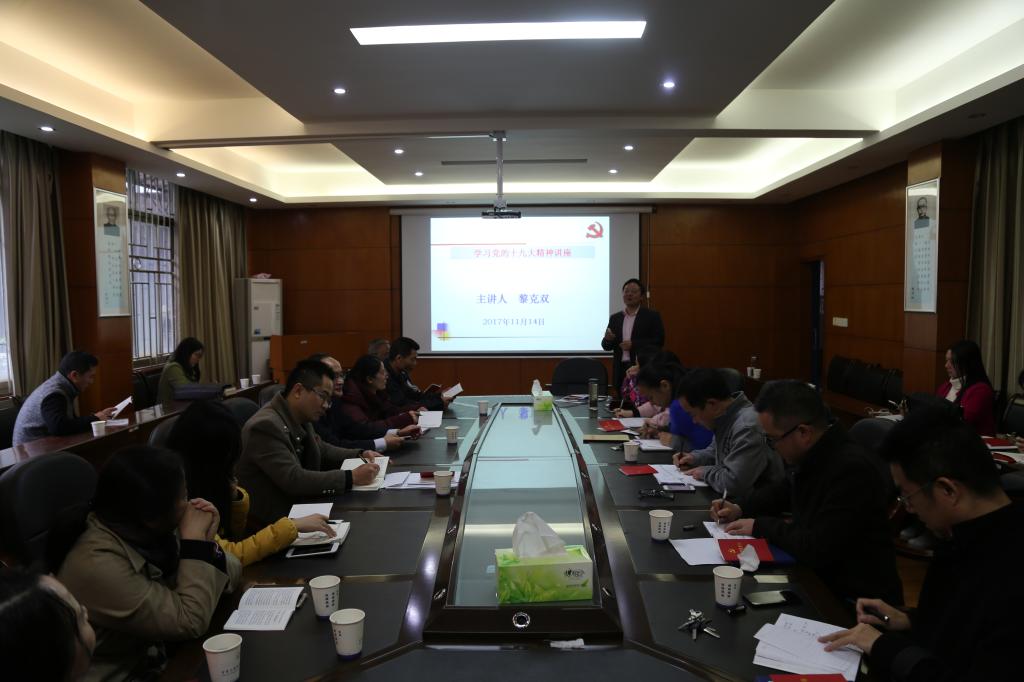 为进一步深入、系统学习和理解“党的十九大”精神,准确把握大会主题,深入理解内涵实质,11月14日下午,党委书记黎克双在院会议室给全体教职工党员,员工支部书记、副书记以及部分党外教职工进行了“党的十九大”精神专题辅导报告。